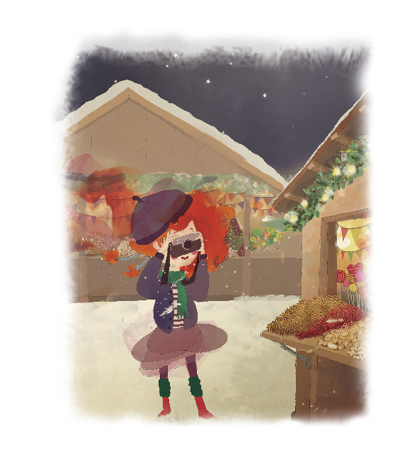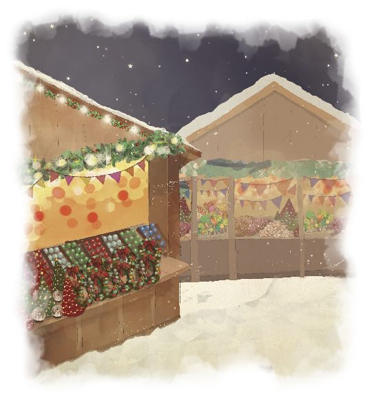Un mercado repleto de casetas de madera dónde venden todo tipo de decoraciones: calendarios de adviento, figuras de angelitos, campanas, estrellas,...