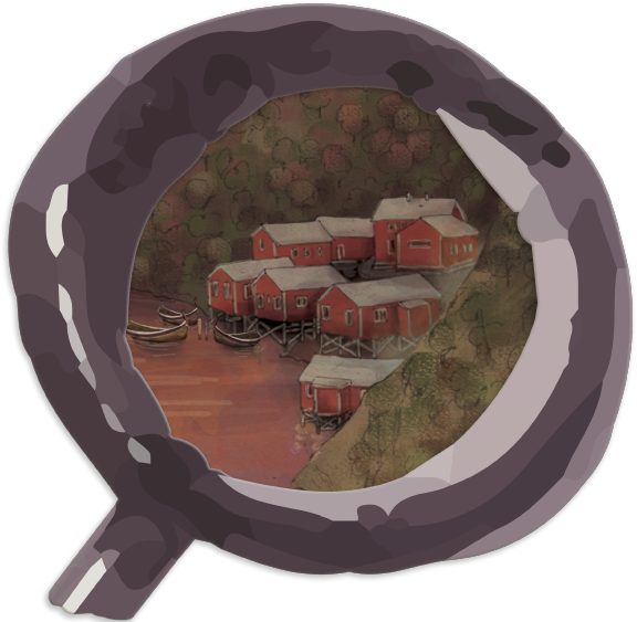 Les muntanyes escarpades estan completament verdes i el mar, blavíssim. Al fons, s'hi veu un poblet pescador amb tot de casetes vermelles amb finestres blanques.